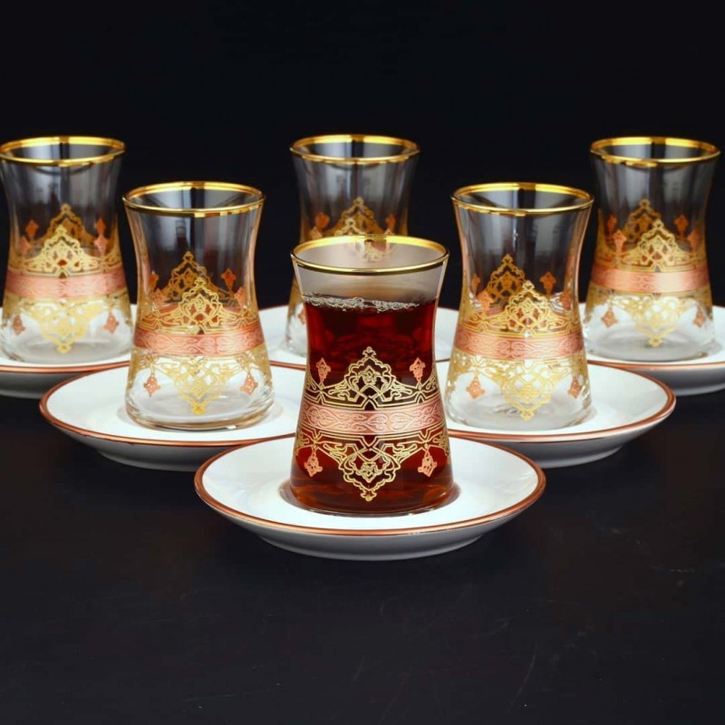 Set Includes: 6 Thin Waist Tea Glass Cups, 6 Porcelain Saucers
