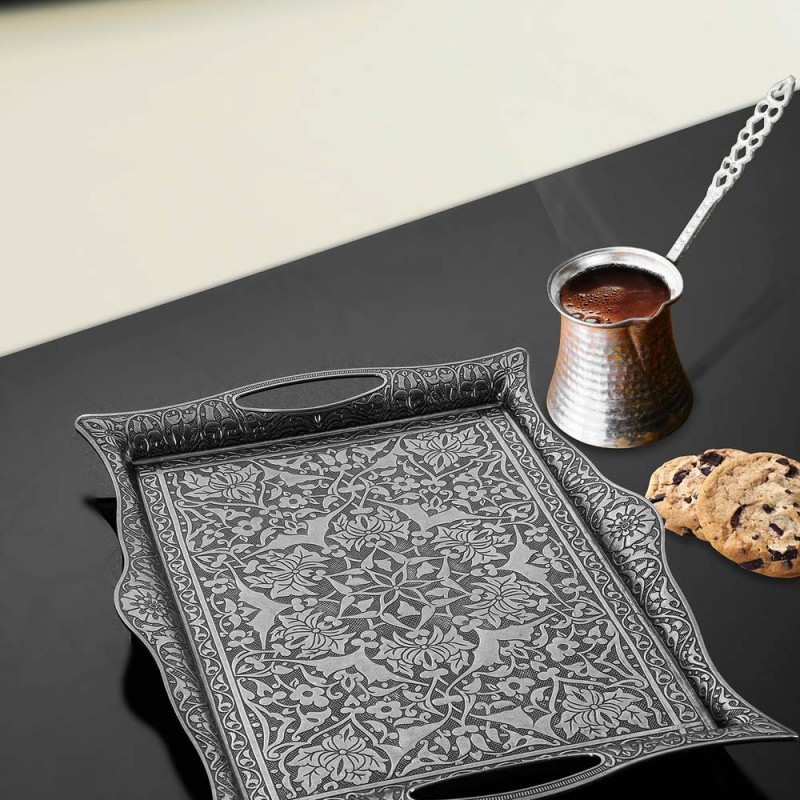 Silver Plated Turkish Style Tea TrayWidth: 27cmLength: 37cmMaterial: Zinc CastingColor: Silver ..