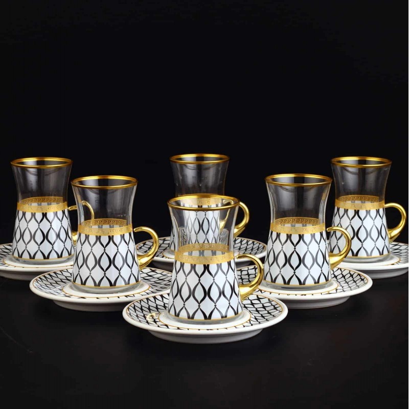 Set Includes: 6 Thin Waist Tea Glass Cups, 6 Porcelain Saucers