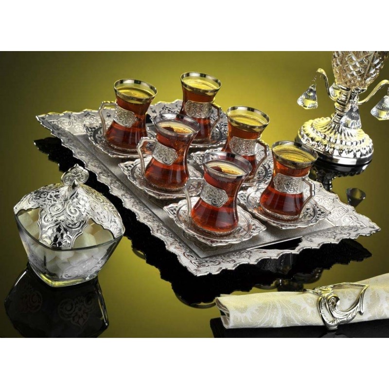 Silver Plated Turkish Tea Set For Six With Sugar Bowl