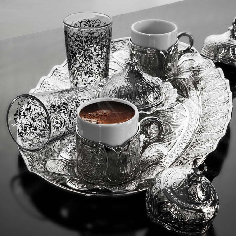Turkish Coffee Cup Set For Two Person With Glasses Silver